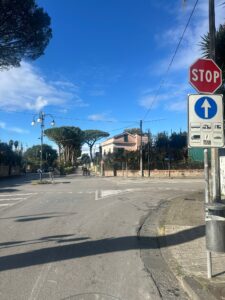 Proseguendo fino all’incrocio di Viale dei Pini con via Paola Zancani, il capolavoro si compie: un vecchio segnale verticale di stop resiste al tempo, ma sull’asfalto, in piena contraddizione, appare un diritto di precedenza.